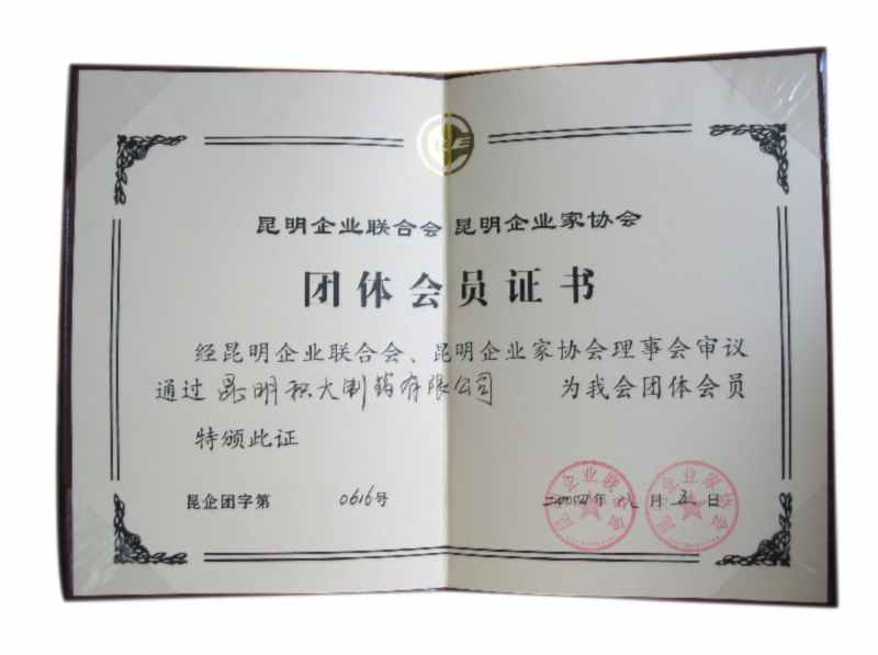 2004年8月5日經(jīng)昆明企業(yè)聯(lián)合會(huì)、昆明企業(yè)家協(xié)會(huì)理事會(huì)審議通過昆明積大制藥有限公司為團(tuán)體會(huì)員。