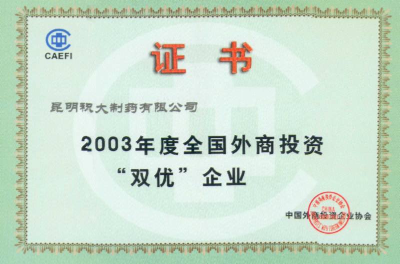 中國(guó)外商投資企業(yè)協(xié)會(huì)授予2003年度全國(guó)外商投資“雙優(yōu)”企業(yè)。