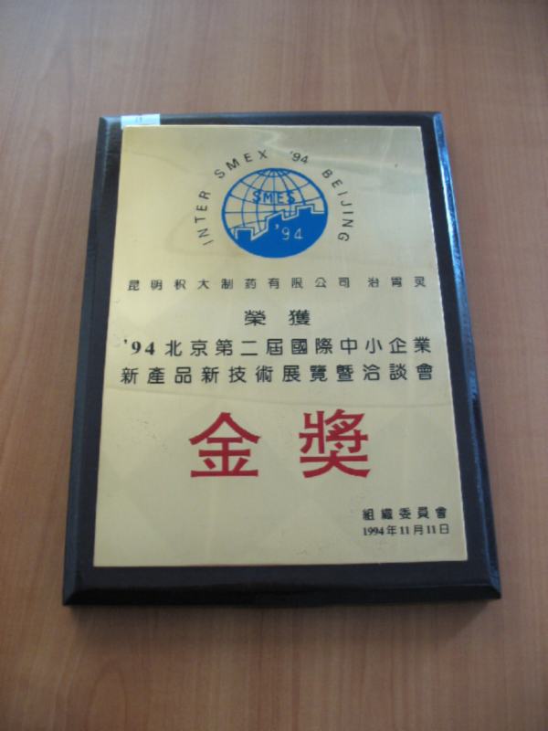 1994年11月11日,治胃靈(鉍鎂碳酸氫鈉片)榮獲`94年北京第二屆國際中小企業(yè)新產品新技術展覽及洽談會金獎。