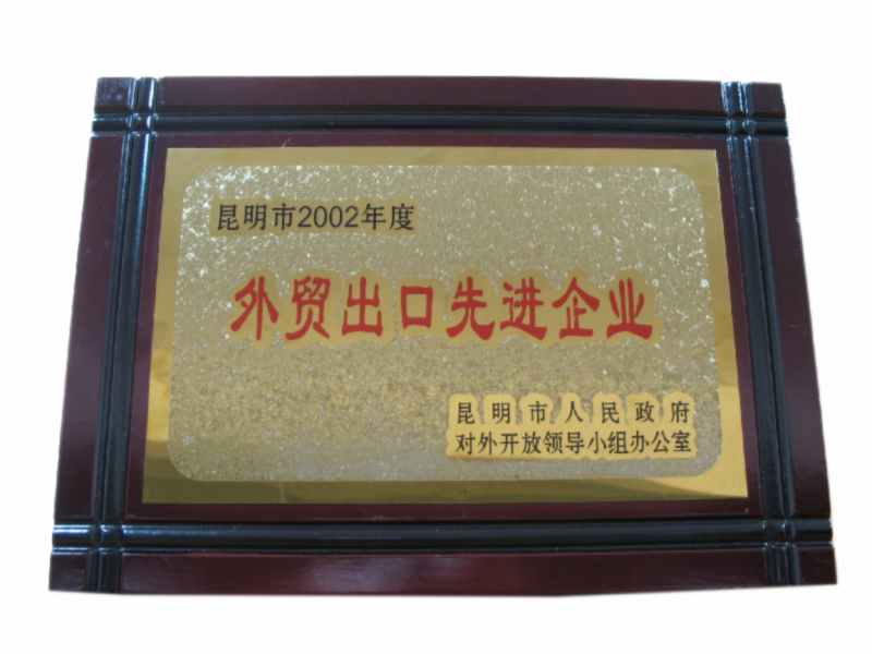 昆明市人民政府對(duì)外開(kāi)放領(lǐng)導(dǎo)小組辦公室授予昆明市2002年度外貿(mào)出口先進(jìn)企業(yè)。