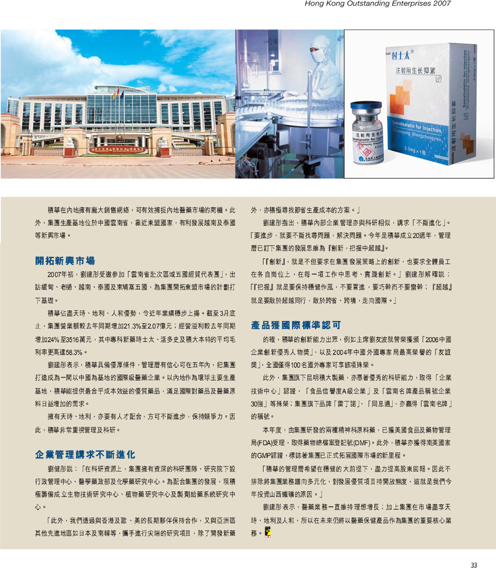 公司合資外方積華藥業(yè)有限公司隸屬的積華生物醫(yī)藥控股有限公司近日傳來(lái)喜訊,由香港《經(jīng)濟(jì)一周》主辦的“香港杰出企業(yè)巡禮”活動(dòng)中,積華生物醫(yī)藥控股有限公司喜獲“2007香港杰出企業(yè)”榮譽(yù),成為本年度獲此殊榮的36家上市企業(yè)之一。